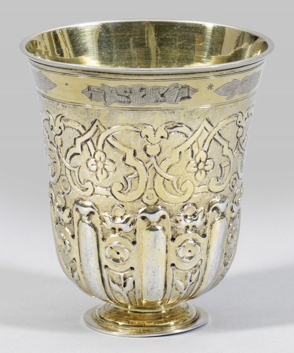 Seltener, barocker Kiddusch-Becher Silber, vergoldet. Hochgezogener Stand, sich konisch erweiternder Korpus mit profiliertem Lippenrand. Wandung mit Blütenmotiven umlaufend godroniert, darüber ziseliertes Bandelwerk. Gest. Stadtmarke, Meister Georg Philipp Steu(e)rnagel (um 1675 - 1727, Meister 1706). Gew. ca.104 g. H. 8,5 cm.