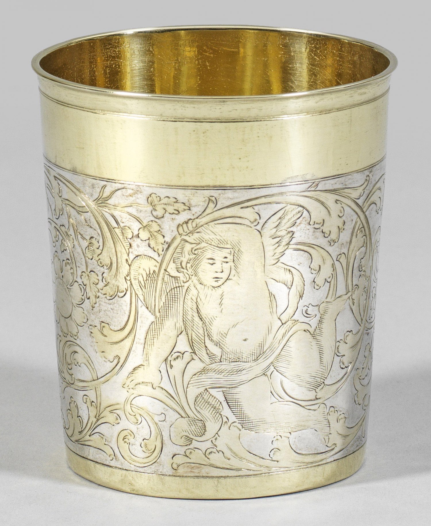 Barockbecher mit Amoretten Silber, vergoldet. Gering konisch mit profilierten, glatten Randzonen. Wandung umzogen von graviertem Rankenwerk als Rahmung für zwei spielende Amoretten. Gest., Tremolierstrich, Stadtmarke, Meister Johann Betz (wird Meister 1659). Gew. ca. 94 g. H. 7,8 cm.
