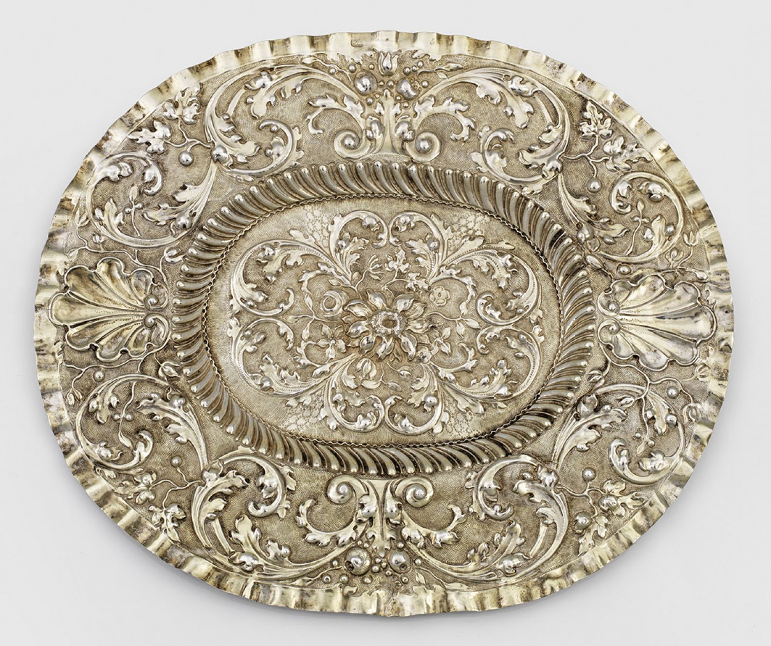 Augsburger Barock-Schauplatte Silber, teilvergoldet. Oval. Leicht vertiefter Spiegel und breite Fahne, abgesetzt durch geschweiften Zungenfries sowie flächendeckend fein getrieben und graviert in Form von Akanthusblattranken und großen Muscheln. Gewellter Rand. Minim. rest.; Gest., Tremolierstrich, Stadtmarke, Meister Samuel Schneeweiss (wird Meister um 1670). Gew. ca. 202 g. 27,6 cm x 24 cm.