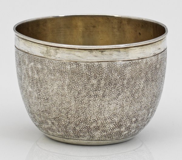 Barock-Tummler Silber. Über eingezogener Standfläche sich konisch erweiternder Korpus mit flächendeckendem Schlangenhautdekor. Statdtmarke. Gew. ca. 79 g. H. 5,1 cm.