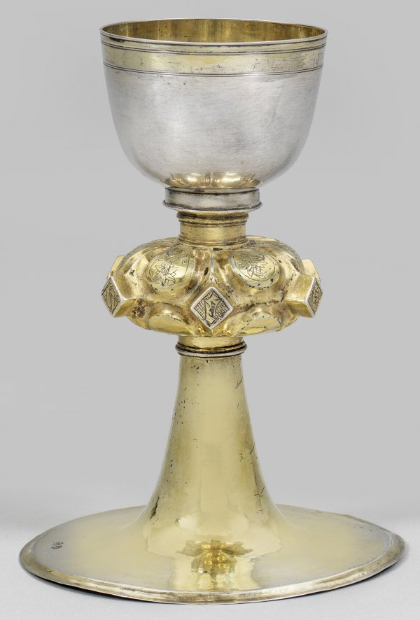 Rothenburger Abendmahlskelch Silber, teilw. vergoldet. Über einem profilierten, trompetenförmig hochgezogenen Stand, übergehend in kurzen Balusterschaft, ein gedrückter, großer Nodus mit würfelartigen Ausbuchtungen, gerahmt von gravierten Blumenmotiven. Darüber eine später ergänzte konische Kuppa mit durch Profillinien verziertem Lippenrand. Gest. Stadtmarke, undeutl. Meistermarke. Gew. ca. 580 g. H. 28 cm.