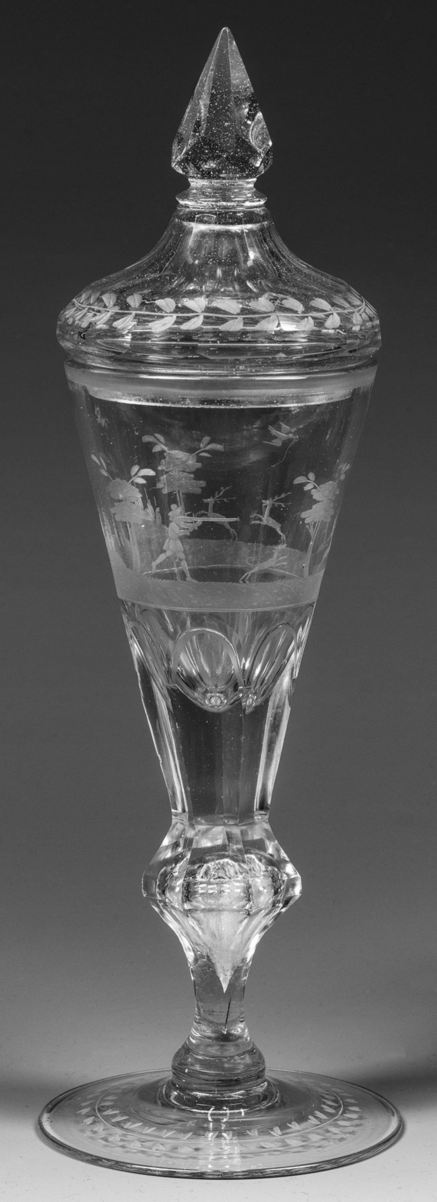 Deckelpokal mit Hirschjagdszene Farbloses Glas. Scheibenfuß mit Abriss, Hohlbalusterschaft mit großer, eingestochener Luftblase, hohe, konische Kuppa sowie glockenförmiger Deckel mit spitzem Knauf. Facettierter Schaft und geschälter Kuppaansatz mit Rundbögen, korrespondierender, facettierter Deckel. Matt geschnittener Dekor aus einer Jagdszene in stilisierter Landschaft, auf dem Fuß und Deckel eine Blattbordüre. H. 28 cm.