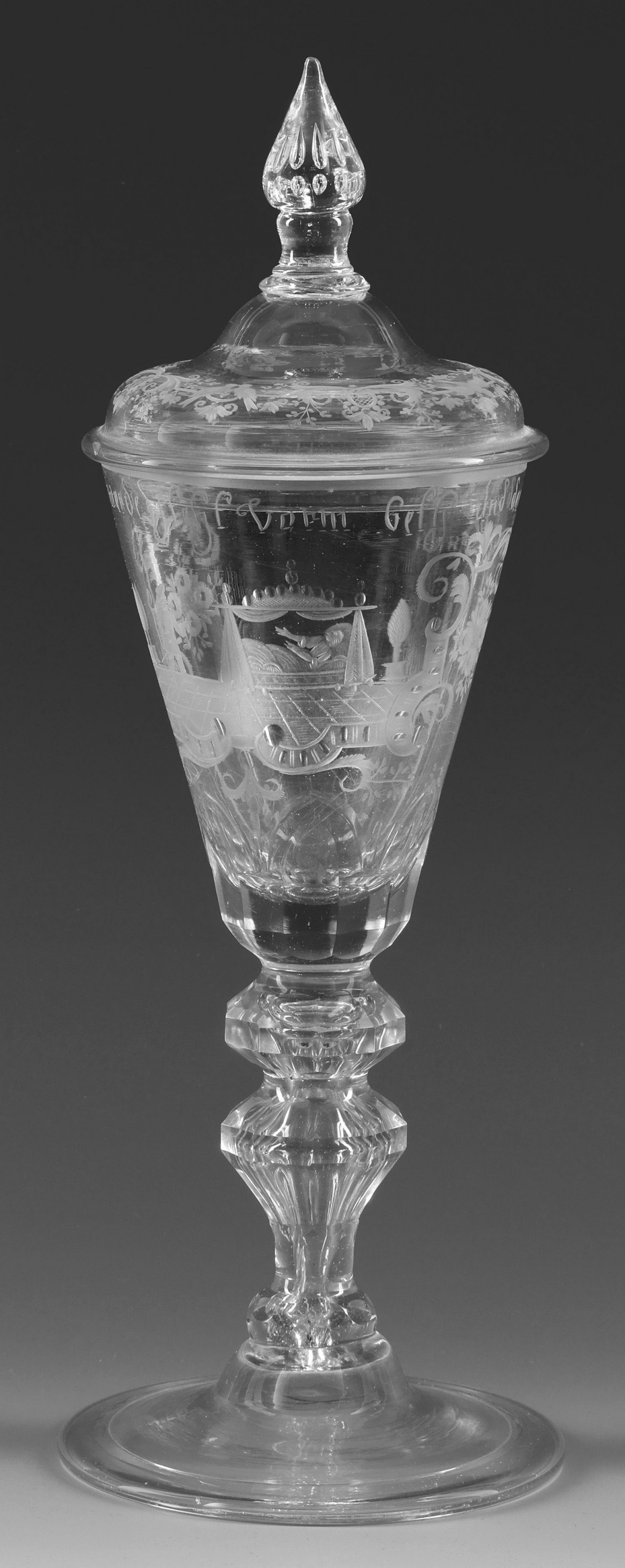 Pokal mit erotischer Szene und Sinnspruch Großer Pokal mit erotischer Szene und Sinnspruch. Farbloses Glas, fein geschliffen. Konische Kuppa, geschälter Ansatz, facettierter Balusterschaft, mittig ansteigender Fuß mit umgeschlagenem Rand. Matt geschnittener, teilw. geblänkter Dekor. Schauseitig erotische Szene mit einem Herrn und einer vor ihm in einem Himmelbett liegenden Dame. Korrespondierender Sinnspruch im Dialekt: "das ist eine grosse pein werde steht vorm beth und darff nicht nein". Gewölbter Deckel, im tropfenförmigen Knauf kleine, eingestochene Luftblasen, am Rand eine umlaufende, geschnittene Bandelwerkbordüre mit Tauben und Taubenpaaren. Ges.-H. 33,2 cm.
