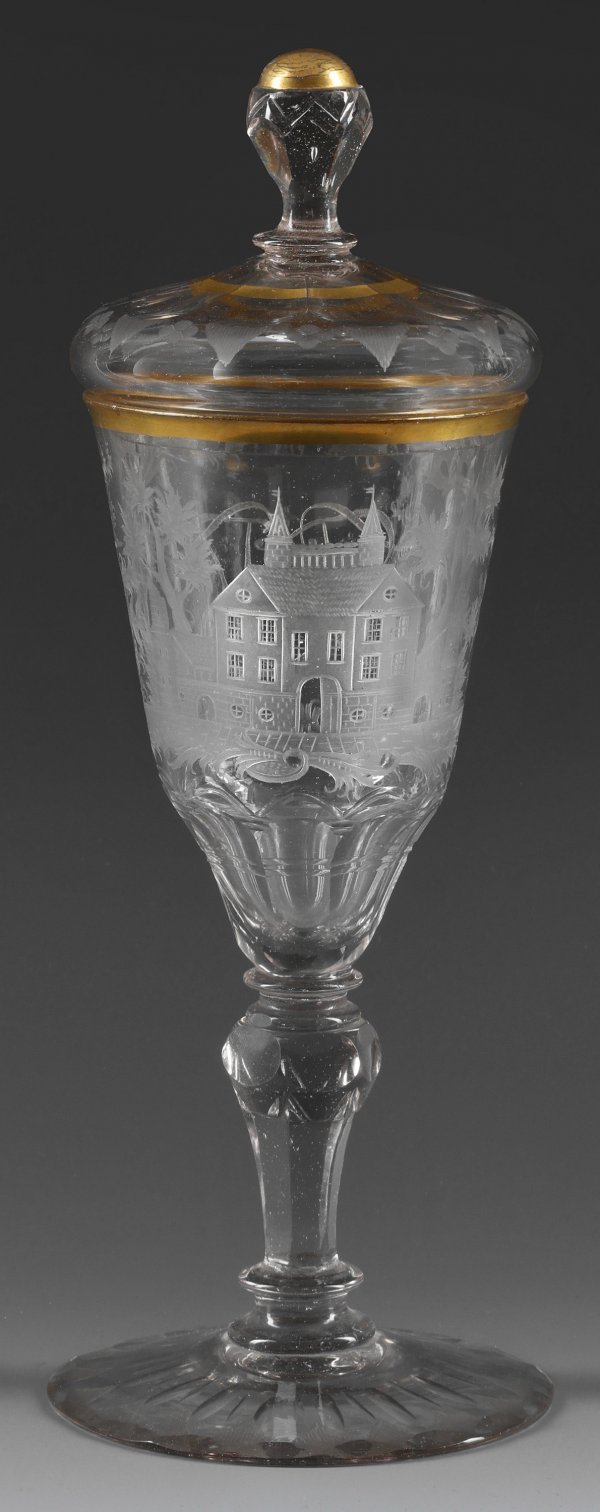 Schlesischer Deckelpokal mit Monogramm und Schlossdekor Farbloses Glas, geschliffen, goldgerändert. Flacher Scheibenfuß mit Bodenrosette, auf der Oberseite eine Bordüre aus mandelförmigen Schliffbögen und schraffierten Dreiecken. Facettierter Balusterschaft mit Scheibennodi, konische Kuppa, geschälter Ansatz mit Bogenbordüre. Auf der Kuppa geschnittener, teilw. geblänkter Dekor aus einem Spiegelmonogr. in einer Rocaillenkartusche, rücks. ein Schloss in stilisierter Landschaft. Zugehöriger, leicht gewölbter Deckel mit Facettenschliff und schraffierter Dreiecksbordüre. Äußerst minim. best.; Ges.-H. 29,3 cm.