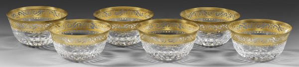 Satz von sechs Saint-Louis-Schalen "Stella Gold" Farbloses Kristallglas. Weite Glockenform. Bodenstern, untere Wandungszone mit Keilschlifffries, der Rand mit geätzter und vergoldeter Akanthusfriesbordüre. Jeweils mit rundem Firmen-Ätzstempel "CRISTAL ST LOUIS FRANCE". D. 11,5 cm.