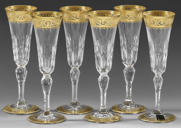 A set of six French Saint-Louis "Thistle Gold" champagne flutes.