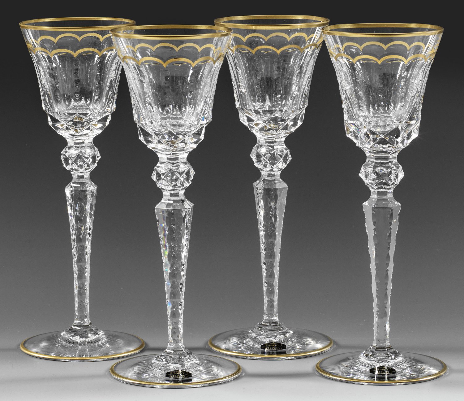 Four large cut and gilt French Saint-Louis "Excellence" water glasses ("verres à eau americain"). Three glasses with factory label.