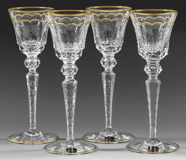 Vier große, hohe Saint-Louis-Wassergläser "Excellence" Farbloses Kristallglas, geschliffen und goldgerändert. Sog. "Verre à eau americain". Flacher Scheibenfuß mit Bodenstern, sechseckiger, schlanker Balusterschaft mit gesteineltem Kugelnodus, hohe, glockenförmige Kuppa mit reichem Zierschliff. Drei Gläser mit wabenförmigem Firmenetikett, auf schwarzem Grund goldene Inschrift "CRISTAL SAINT LOUIS FRANCE" mit Krone und Dat. 1767. H. 26,2 cm.