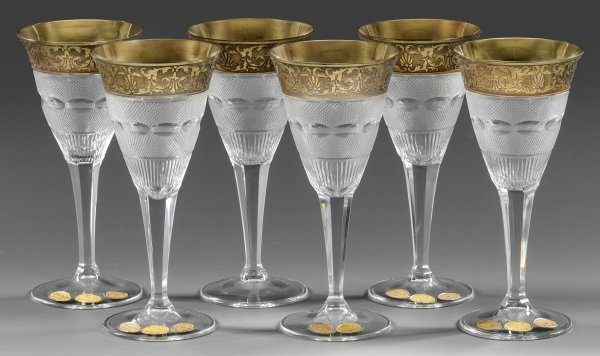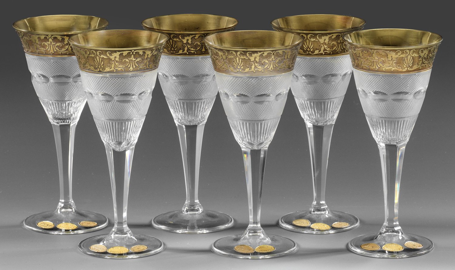 Satz von sechs Moser-Sherrygläsern "Splendid" Farbloses Kristallglas, geschliffen. Flacher Scheibenfuß, facettierter Stiel, die hohe, glockenförmige Kuppa mit flächendeckendem Schliffdekor, Lippenrand mit vergoldetem, geätztem, sog. oroplastischem Friesband aus Palmetten und Akanthusranken. Auf fünf Gläsern ovales, goldfarbenes Firmen-Etikett "Moser", Etikett mit Bez. "FIRST QUALITY", vier Gläser mit Etikett "MADE IN CZECHOSLOVAKIA". H. 15 cm.