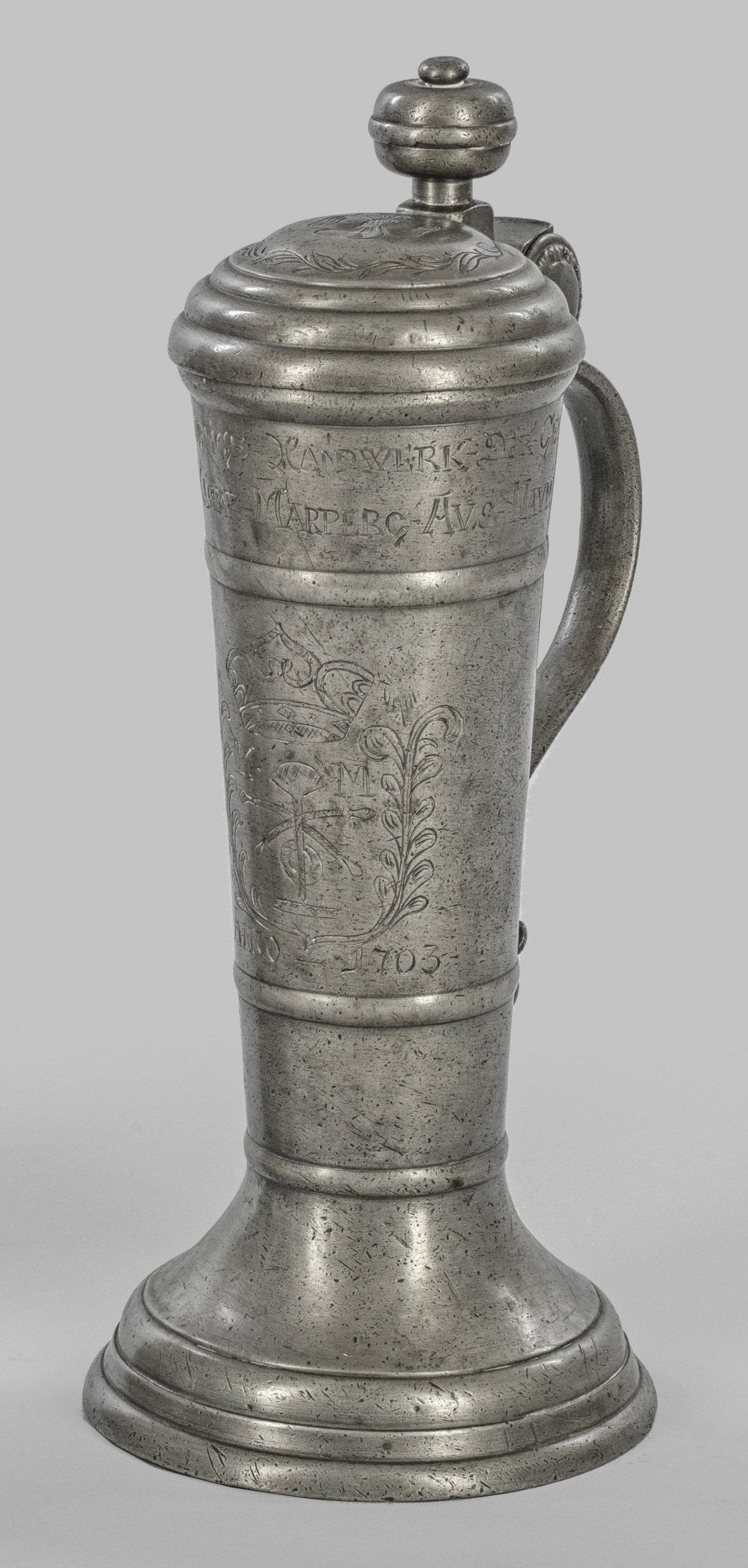 Zunftrörken der Gerber Zinn. Über haubenartig gewölbtem Stand konischer, von Profilrillen gegliederter Korpus mit leicht gewölbtem Deckel. Schauseitig auf der Wandung graviertes, bekröntes, von Blattranken gerahmtes Zunftwappen, darüber bez. " Von Kaspar Marperg aus Naumburg", dat. 1703. Auf dem Deckel eine von Ranken umgebene Blüte. Kugelige Daumrast, Bandhenkel. Undeutl. gem.; H. 33 cm.