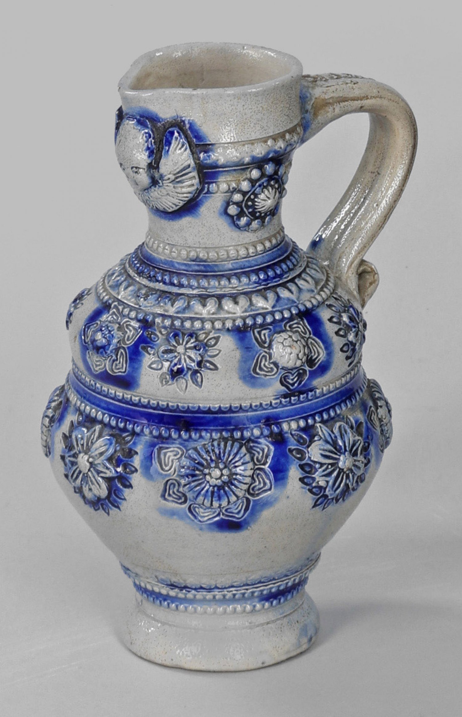 Kleine Enghalskanne Salzglasiertes, graues Steinzeug. Gebauchter, im oberen Drittel eingeschnürter Korpus, leicht konischer Hals mit kurzer Schnaupe. Bandhenkel mit volutiertem Ansatz. Aufgelegter, gestempelter und kobaltblau staffierter Dekor aus einem Engelskopf sowie Rosetten-, Herz- und Perlfriesen. H. 17,5 cm.