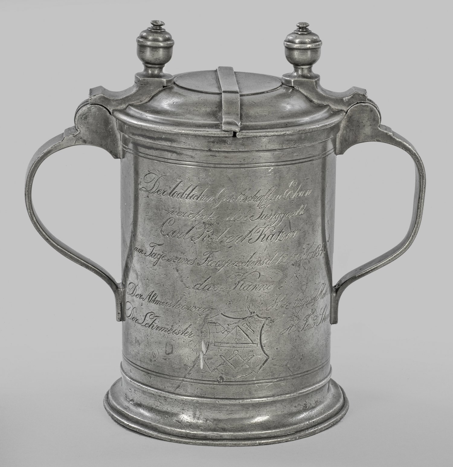 Seltener Zunftkrug des Maurerhandwerks Zinn. Über flachem Standring hoher, zylindrischer Korpus. Glatte Wandung mit zweiseitig gravierter Widmung, graviertes Zunftwappen, Namen der Zunftangehörigen, des Alt- und des Lehrmeisters sowie des die Lehre beendenden Maurererlehrlings, dat. 12. Jan. 1845. Mittig geteilter, beidseitig zu öffnender, flacher Deckel mit je einer kugeligen Daumrast. Zwei geschwungene Henkel. Innen ein eingesetztes Muskatnusssieb. H. 25,5 cm.
