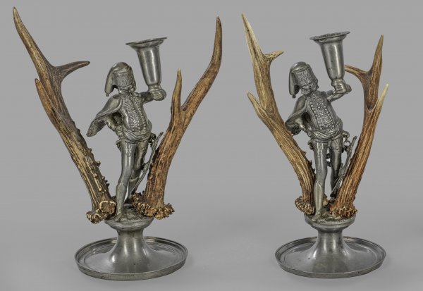 Paar Jagdleuchter 1-flg.; Zinn und Rehgehörn. Runder Zinnfuß, reich gestalteter Schaft aus Gehörn und Zinn, mittig vollplastisch als Schaft gearbeitete und montierte Figur eines Kosaken, eine vasenförmige Tülle haltend. Fuß erg.; H. 22 cm - 25 cm.
