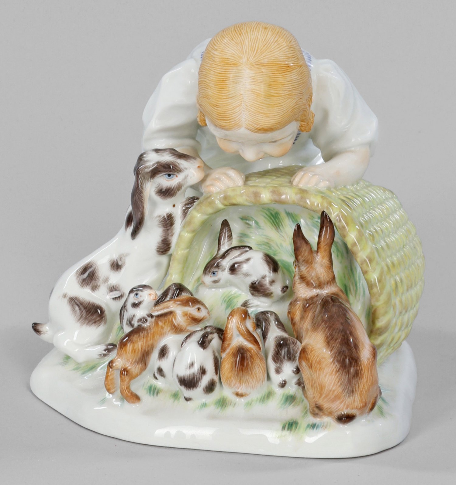 "Kind mit Kaninchen". Originaltitel Auf unregelmäßigem, naturalistisch gestaltetem Sockel kniendes Mädchen, einen Kaninchenwurf in einem Korb betrachtend. Polychrome Malerei. Entw. Max Bochmann. Modell-Nr. 73441. Schwertermarke. H. 12 cm.
