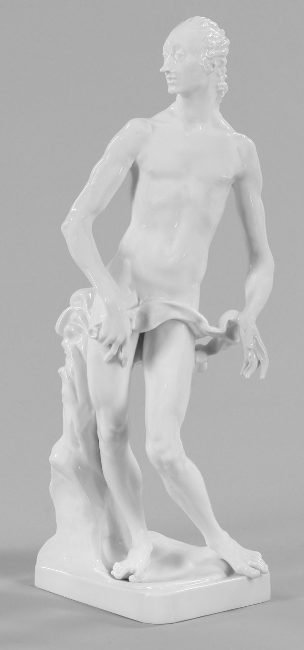 "Apollo". Originaltitel Weißporzellan. Auf einem erhöhten Rechtecksockel, graziös stehender, wenig bekleideter Apollo mit lockigem, über den Nacken fallendem Haar. Entw. Paul Scheurich, 1918. Zeptermarke. H. 39 cm.