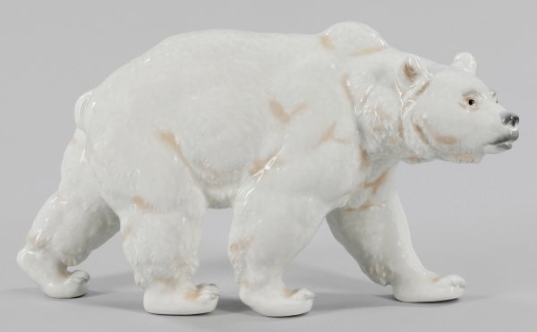 Großer schreitender Bär Vollplastisch ausgearbeitet mit nach rechts gewandtem Kopf. Schwarze Augen sowie reliefierte und dezent staffierte Fellzeichnung in hellen Brauntönen. Sparsame, polychrome Aufglasurmalerei. Entw. Hermann Fritz, 1943. Schwertermarke. H. 25,5 cm.