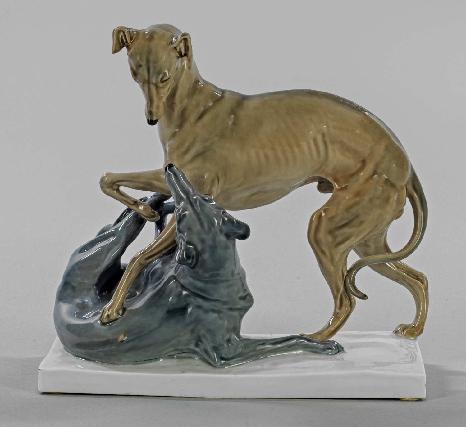 "Italienisches Windspiel". Originaltitel Auf flachem, weißem Rechtecksockel dynamisch bewegte Gruppe von Windhunden beim Spiel. Unterglasurblaue Malerei in Blau-Grau und Brauntönen. Entw. Otto Pilz, 1909. Entw.-Bez.; Modell-Nr. A 236. Schwertermarke. H. 24 cm. 24 cm x 11 cm.