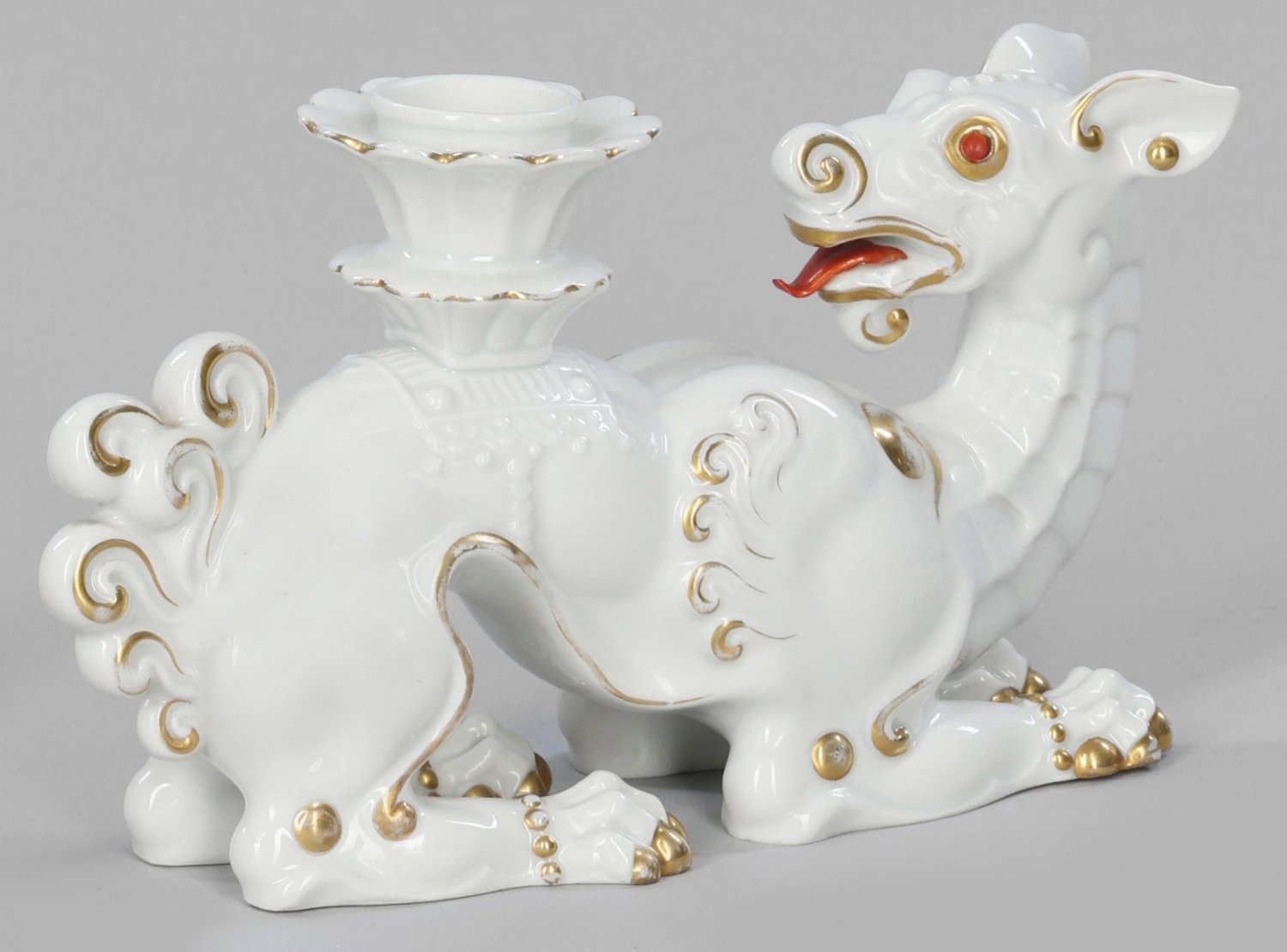 Drachenleuchter bzw. sog. "Höllenhund" mit Kerzenhalter. Vollplastische Groteskendarstellung eines geduckt sitzenden Drachens mit rückwärts gewandtem Kopf und aufgebauschter, lockiger Schwanzmähne. Auf dem Rücken ansetzende, gestuft aufsteigende, blütenförmige Tülle. Weißporzellan mit sparsamer Aufglasurmalerei in Rot und Gold. Entw. Richard Förster (zugeschrieben), um 1929. Manufakturmarke. H. 10,5 cm.