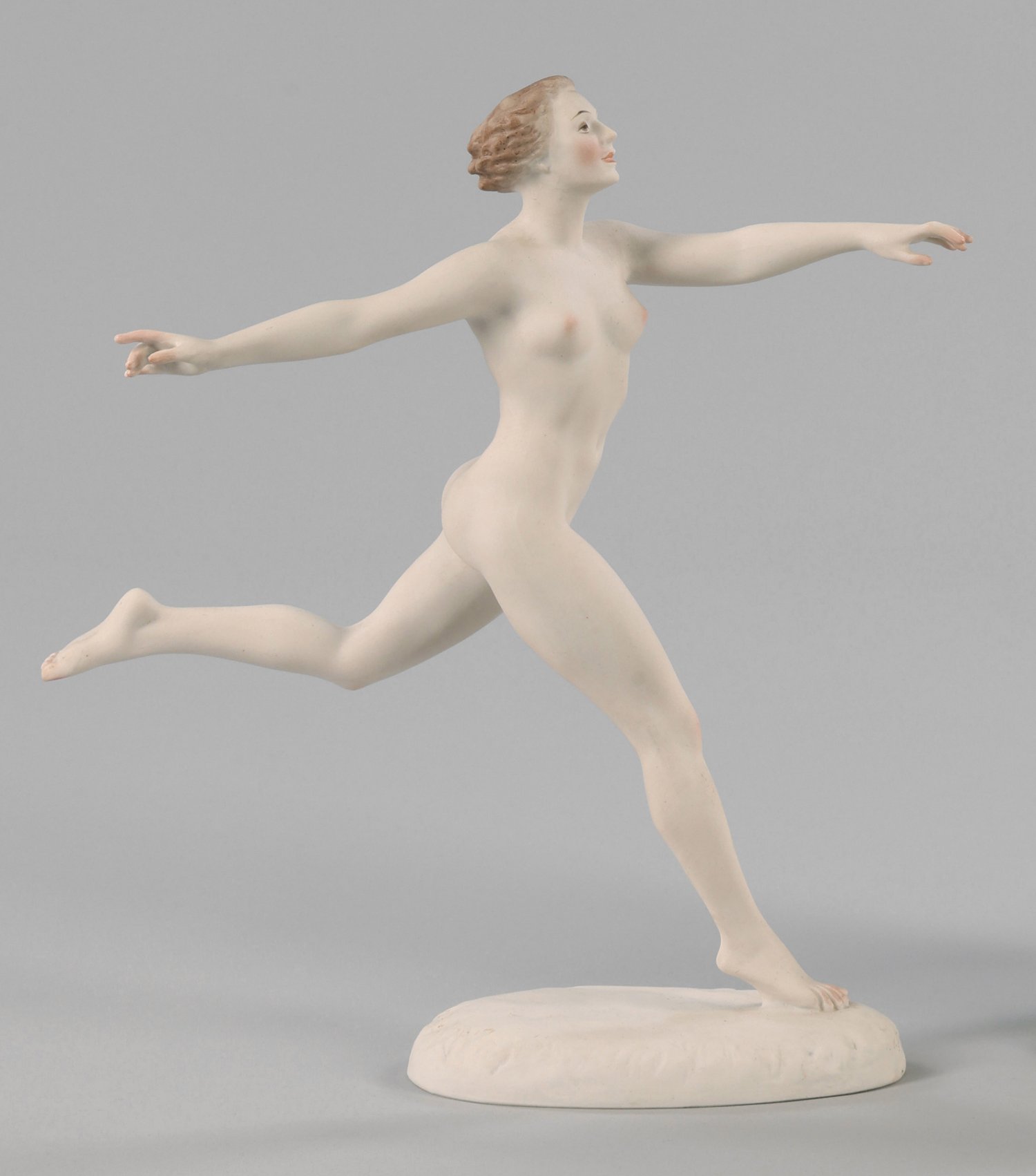 Ausformung in Porzellan nach der Bronzefigur "Läuferin" von 1928/29. Der Bildhauer, der 1893/94 im Atelier Auguste Rodins in Paris arbeitete und später ein eigenes Atelier in Berlin unterhielt, wurde vor allem durch seine Entwürfe weiblicher Akte bekannt.