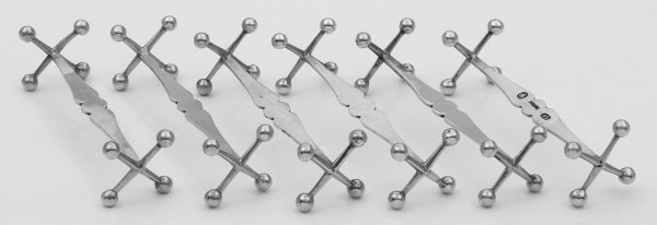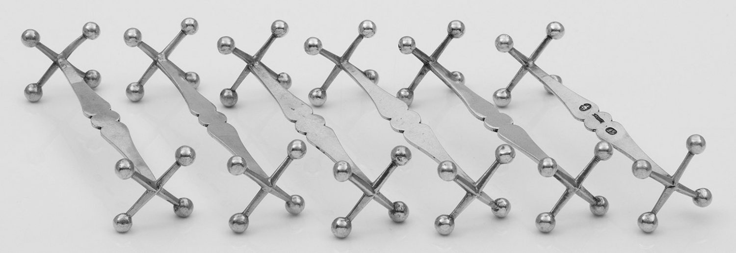 Sechs Messerbänke Silber. Kreuzförmige, in kleinen Kugeln auslaufende Beine, mittig verbunden durch flachen Steg. Gest., Beschaumarke, "V. Nemec", Herstellerzeichen. Gew. zus. ca. 190 g. Br. 9,5 cm.