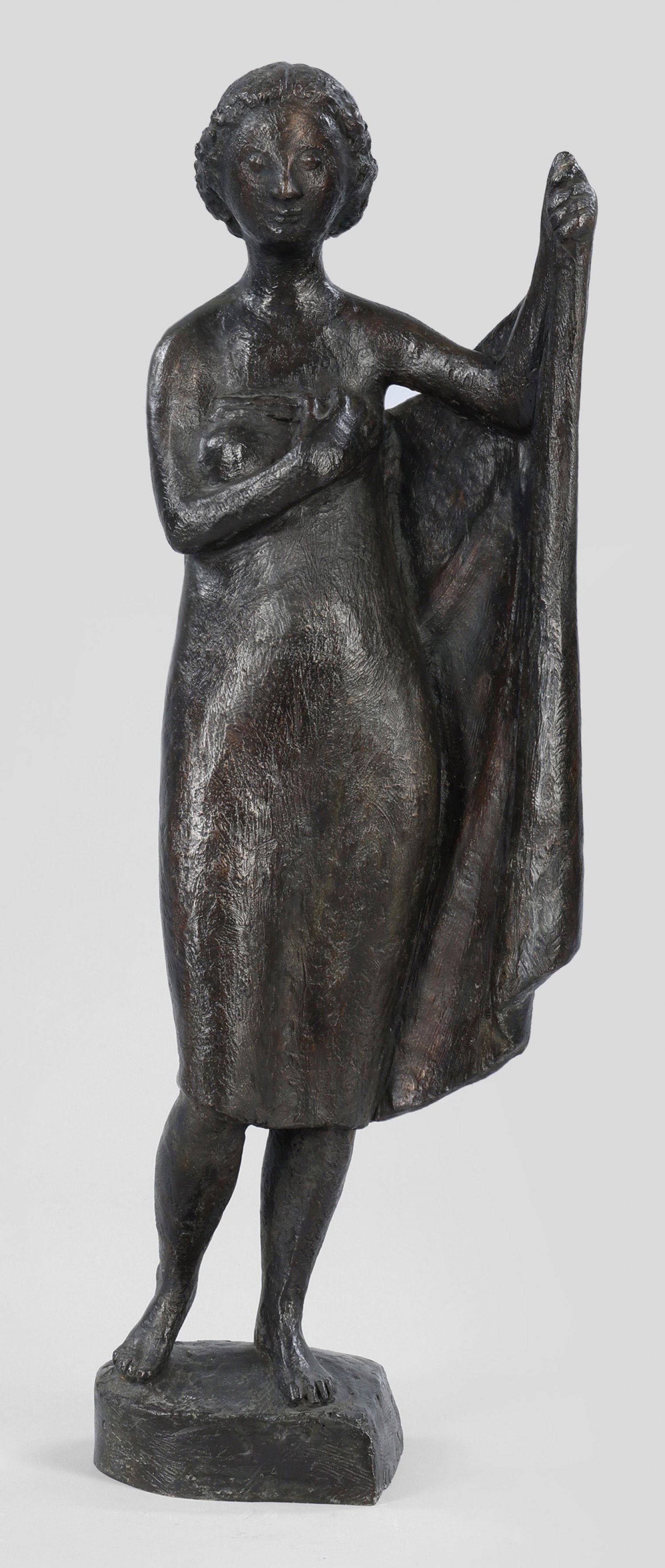 Bronze, dunkel patiniert,1960. Künstler-Signet ("Phönix"). Runder Gießerstempel "SCHMÄKE DÜSSELDORF", nummeriert 8/8. Wvz. Rudloff 749. Marcks wirkte 1919-1924 als Meister am Bauhaus, 1933 verlor er sein Lehramt an der Burg Giebichenstein; seine Werke wurden in der Zeit des Nationalsozialismus teilweise als "entartet" verfemt. 1945 wurde Marcks an die Landeskunstschule Hamburg berufen, ab 1950 arbeitete er freischaffend in Köln und in der Eifel. Diese kontemplative Plastik, bei der es auch um das Verhältnis von Körper und Gewand geht, ist charakteristisch für das Oeuvre des bedeutenden deutschen Bildhauers der Klassischen Moderne. Seine stehenden, liegenden oder sitzenden, in auf das Wesentliche der Form und des Ausdrucks komprimierten Aktfiguren zeigen Mädchen bzw. junge Frauen in ihren natürlichen Bewegungen und Haltungen; nie wirken seine stilisierten Figuren heroisch oder pathetisch, sie spiegeln stattdessen in überzeitlicher Weise allgemeine menschliche Grundstimmungen, zuweilen auch eine gewisse Verhaltenheit wider. H. 67,5 cm.
