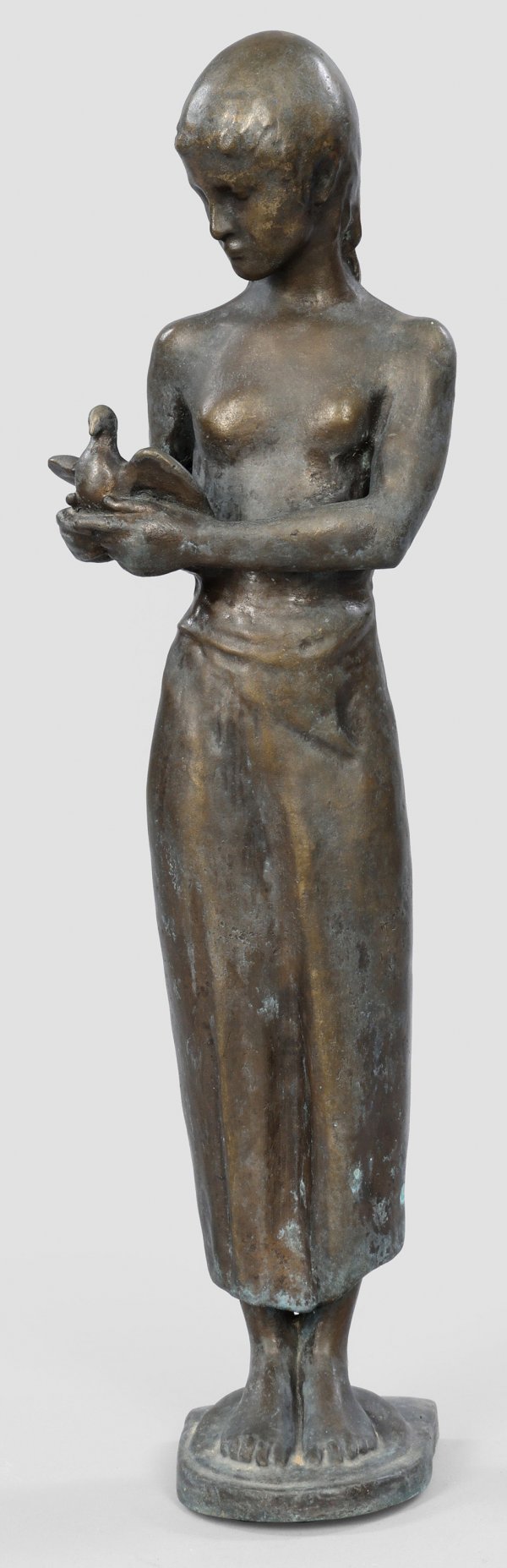 Bronze, braun patiniert. Auf einer halbrund gebogten Plinthe stehendes Mädchen mit Taube. Wohl posthumer Guss der ab 1950 auch in Porzellan von Rosenthal in Selb ausgeführten Statuette. Scheibe gehörte zu den bedeutendsten figürlich arbeitenden deutschen Bildhauern der Klassischen Moderne neben Gerhard Marcks und Georg Kolbe, mit denen er selbst in engem Kontakt stand. Ab 1913 stellte er in der Berliner Secession aus. 1936 ernannte ihn die Preußische Akademie der Künste zum Mitglied, 1955 die West-Berliner Akademie der Künste. Unregelmäßigkeiten in der Patina. H. 57 cm.