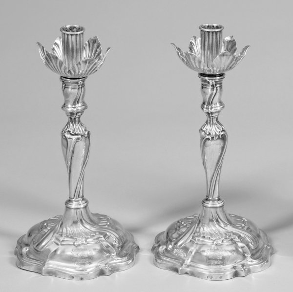 Paar Kerzenstöcke mit Adelswappen Silber. Über godroniertem Fuß balusterförmiger Schaft mit kannelierter Tülle und reliefplastischer Auffangschale aus Blattformen. Auf dem Stand graviertes, bekröntes Adelswappen. Gest. "12" (Lot), Meistermarke. Gew. zus. ca. 700 g. H. 27 cm.