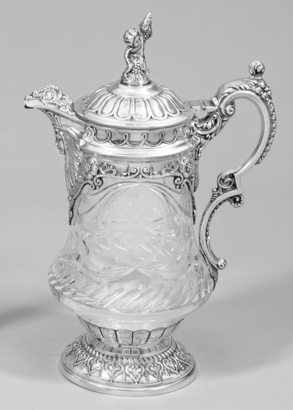 Portugiesische Prunkkaraffe mit Silbermontierungen. Auf reliefiertem Stand balusterförmiger Korpus aus schwerem, farblosem Kristallglas, umzogen von Olivschliff. Von reliefplastischem Weinlaub und Maskaron umzogene Montierung im Rokokostil. Godronierter, gewölbter Deckel mit Knauf in der Gestalt eines Bacchusknaben mit Weinreben. Gest. 925, Herstellerzeichen. H. 35 cm.
