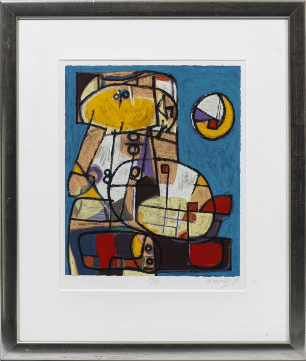 Farbserigraphie/Papier, 1989. Sign. u. betitelt. Seltenes Blatt zum 50-jährigen Bestehen der legendären, 1948-1951 bestehenden Avantgarde-Künstlergruppe "CoBrA", zu der neben Corneille u.a. Pierre Alechinsky, Karel Appel und K. O. Götz gehörten. Darstellung 47 cm x 39,5 cm. Rahmen.
