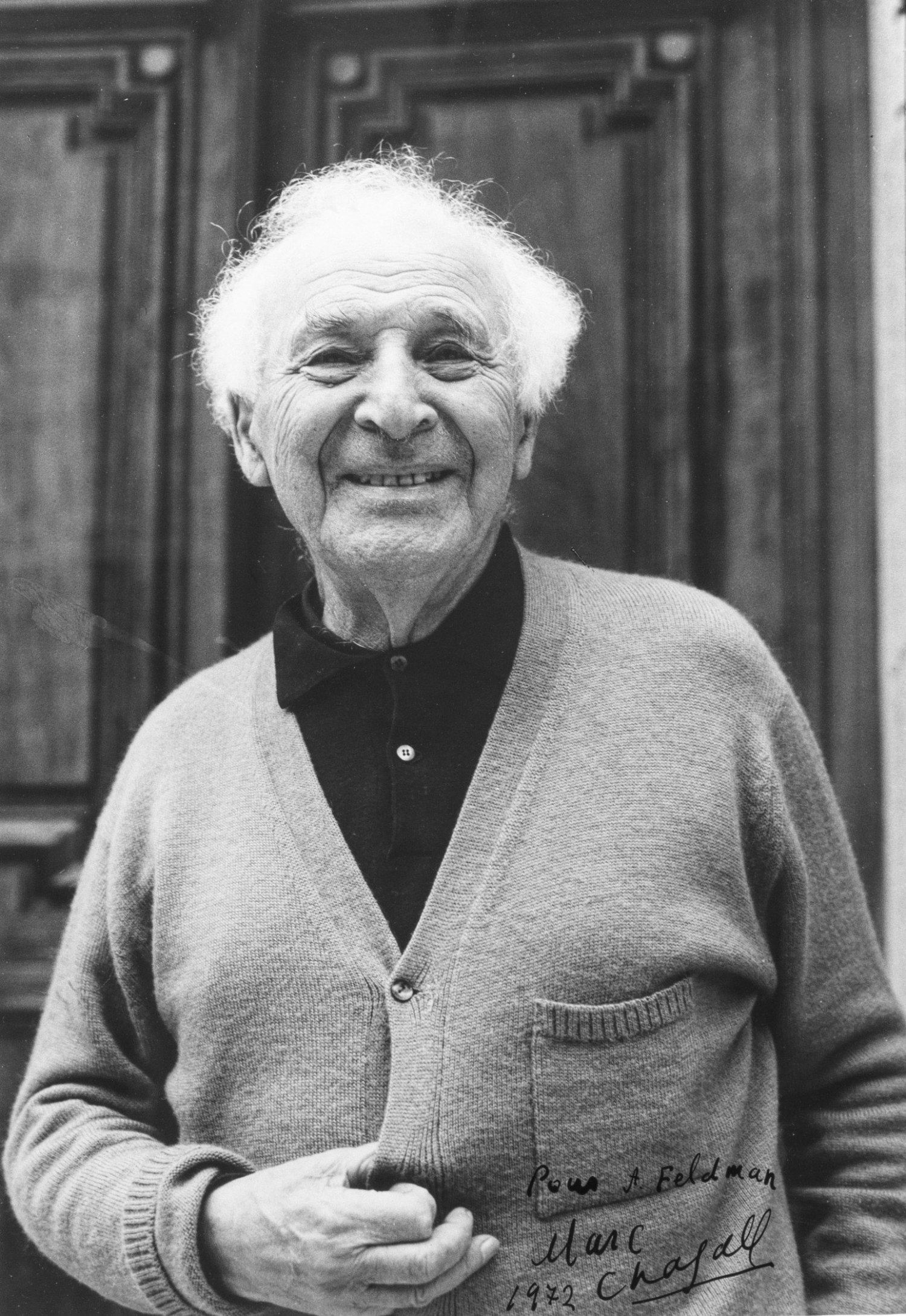 Original-Fotografie. Vintage-Silbergelatine-Abzug. R. u. persönliche Widmung Chagalls "Pour A. Feldman Marc Chagall 1972". Rare, durch seine authentische Unmittelbarkeit künstlerisch herausragende und schöne Porträtfotografie. Villers etablierte sich ab 1953, nachdem ihm Picasso seine erste Kamera angeboten hatte, zum führenden Bildnisfotografen namhafter Künstler und Filmregisseure. Ger. griffspurig, sonst sehr gut erhalten. 40 cm x 30 cm. Rahmen.