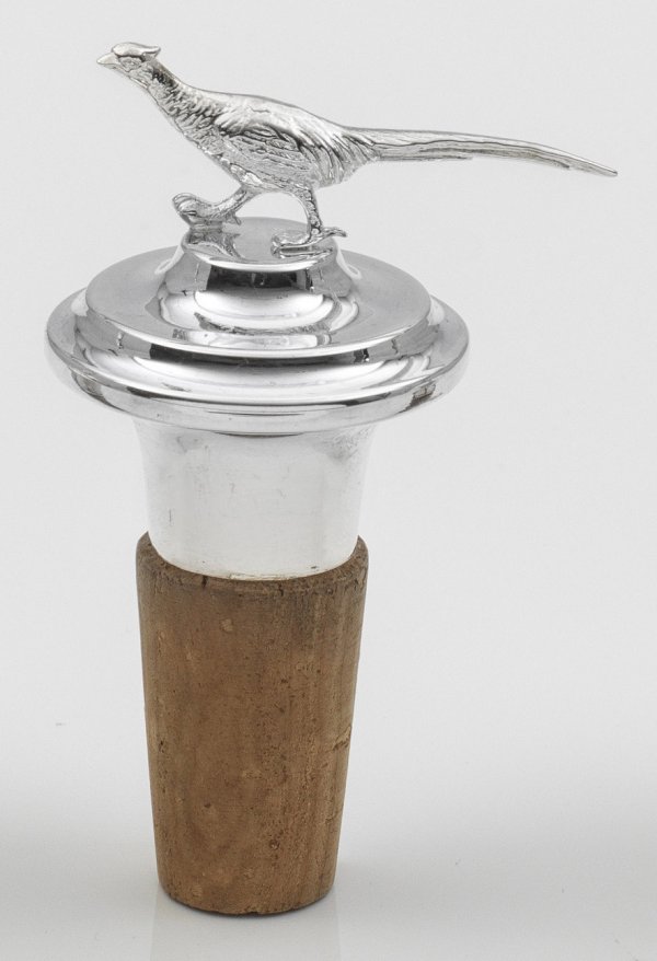 Flaschenkorken mit Silbermontierung. Auf der Oberseite vollplastisch gestalteter Griff in Gestalt eines Fasans. Gest. 925. Ges.-H. 8,5 cm.