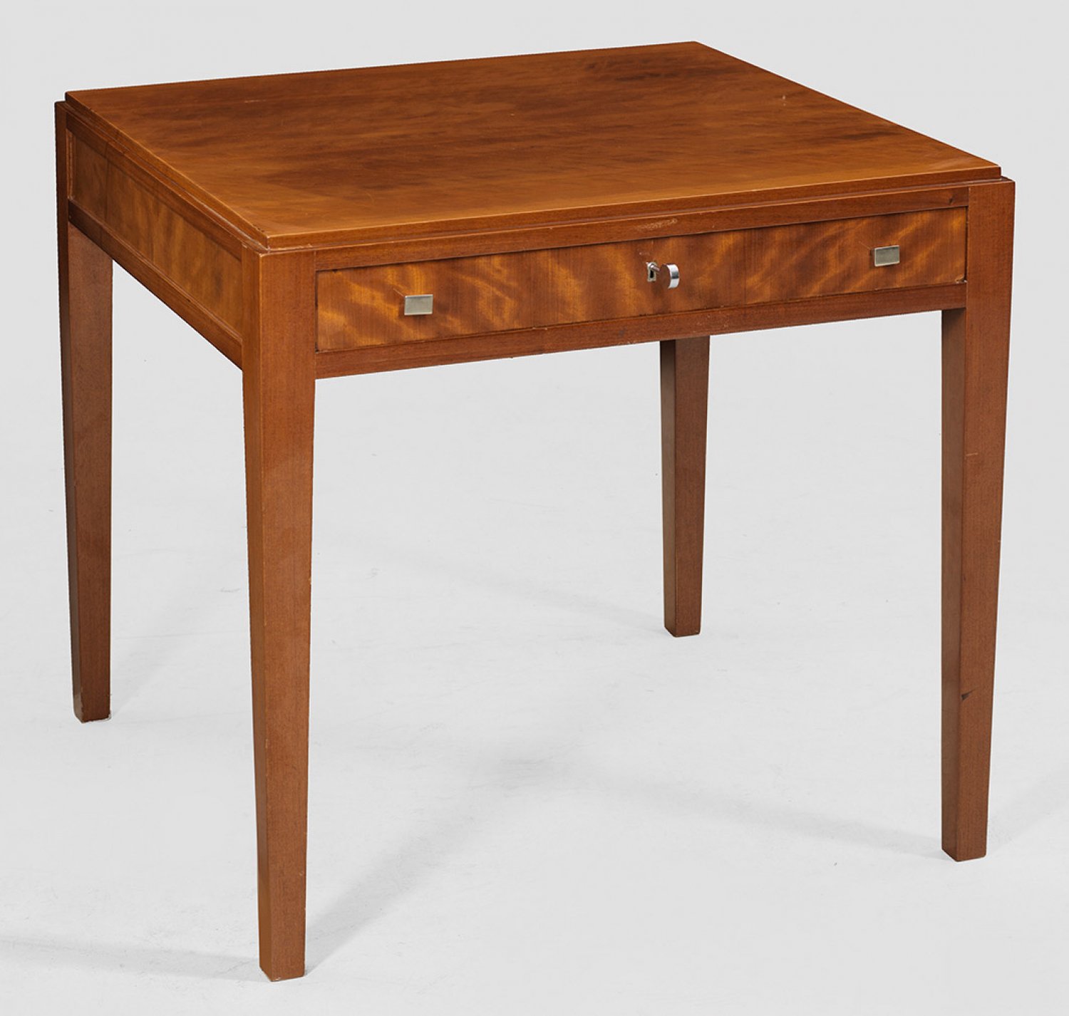 Art Déco-Schreibtisch von Majorelle Mahagoni, furniert. Gerader Zargenkasten aus vertieft angelegten Reserven auf konischen Vierkantbeinen. In der gegliederten Front breites Schubfach mit gekanteten Handhaben. Gestuft ansteigende Deckplatte. Bez. Majorelle Nancy. H. 75 cm. 82 cm x 76,5 cm.
