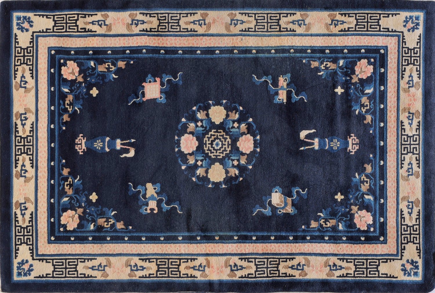 Alte Chinesische Brücke China. Wolle auf Baumwolle. Auf tintenblauem Fond zentrales Rundmedaillon, umgeben von Vasenmotiven und Schriftrollen. Ecklösungen aus Päonien und Blattranken. Umlaufend breite, beigefarbene Bordüre mit Mäandermotiven. 182 cm x 121 cm.