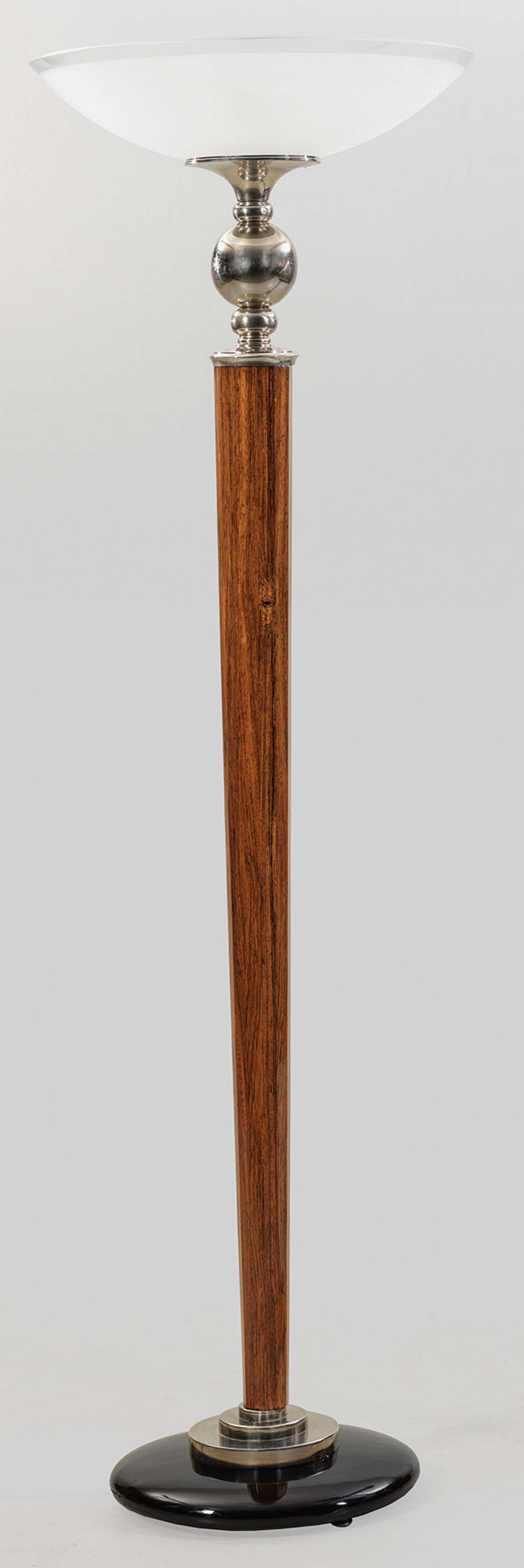 Großer Art Déco-Deckenfluter 1-flg.; Palisander und ebonisiertes Holz sowie Bronze, vernickelt und farbloses, teilw. satiniertes Glas. Über flach gewölbtem Rundsockel und gestuft ansteigendem Podest sich konisch weitender, umlaufend gekanteter Schaft sowie Balusterelement als Träger für flach gewölbte, weit ausladende Lampenschale. Elektrifiziert. Rest.; H. 181 cm.