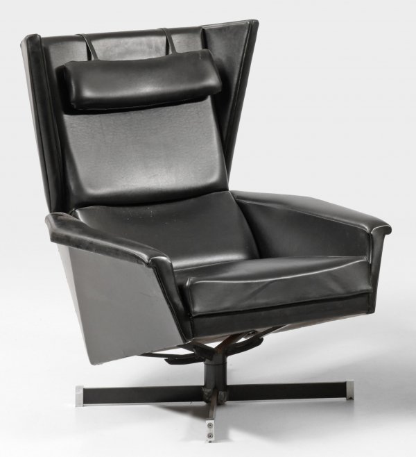 Mid Century-Loungesessel Metall, teilw. verchromt sowie schwarzes Kunstleder. Über Drehfuß aus kreuzförmig angelegten Stegen flache, schräggestellte Sitzfläche. Breit gekantete Armlehnen sowie zurückschwingende Rückenlehne mit spitzen Ohrenbacken. Unbez.; H. 95 cm. 79 cm x 120 cm. Sitz-H. 40 cm.