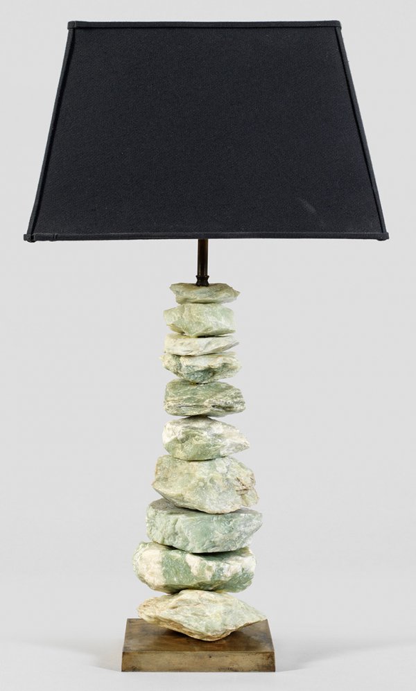 Mid Century-Tischlampe 1-flg.; Bronze und hellgrün gemaserter Fuchsit. Über flacher, quadratischer Sockelplatte unterschiedlich große, gestaffelt angeordnete Gesteinsbrocken sowie oberhalb schmaler Schaft als Träger für Leuchtmittel. Rechteckiger, konisch ansteigender Lampenschirm. Elektrifiziert. H. 75 cm.