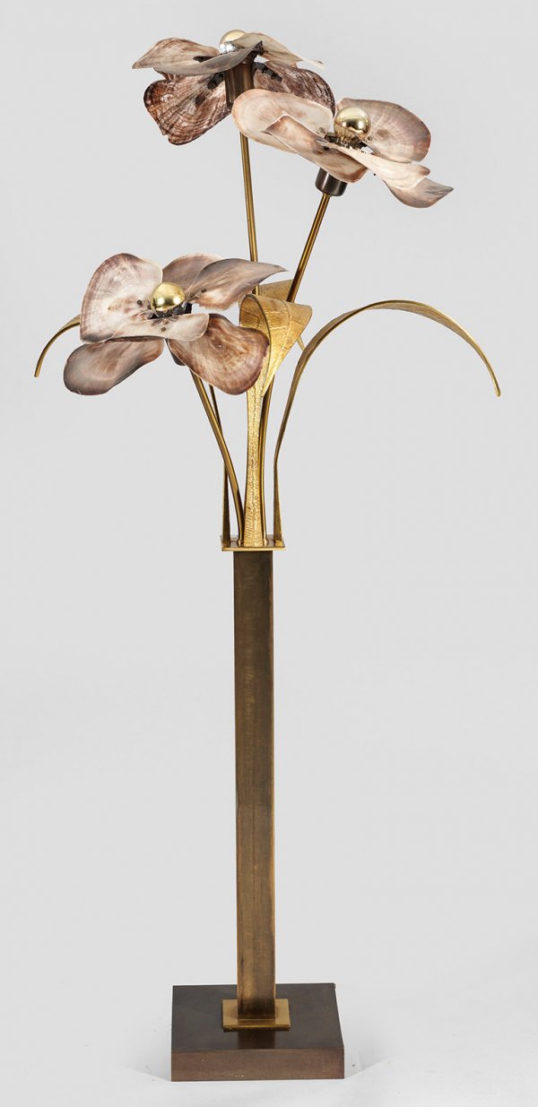 Dekorative Standlampe 3-flg.; Bronze, teilw. vergoldet sowie Muschel. Über quadratischer Plinthe gekanteter Schaft. Oberhalb davon ausgehend gebogte Leuchterarme mit großen, blütenförmigen Lampenfassungen, begleitet von üppigem Blattwerk. Elektrifiziert. H. 133 cm.