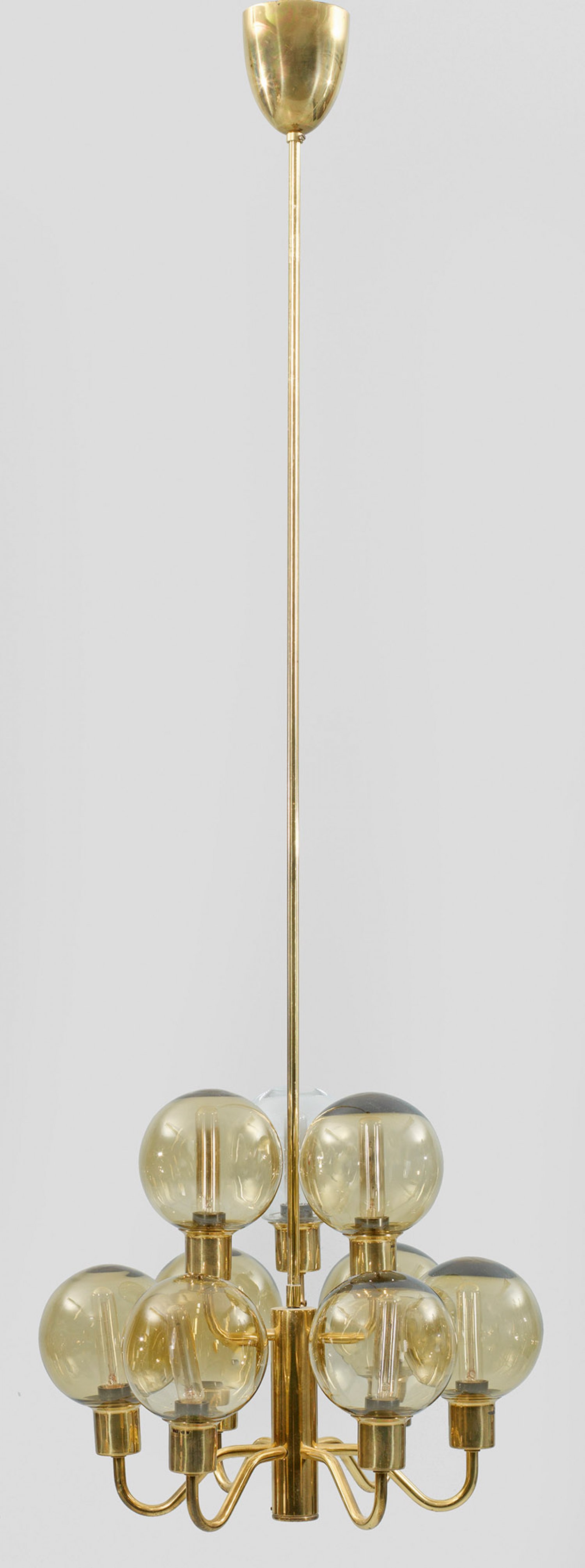 Mid Century-Deckenlampe "Patricia" von Hans-Agne Jakobsson 9-flg.; Messing und rauchfarbenes bzw. farbloses Glas. Zylinderförmiger Korpus, davon ausgehend flach geschweifte Leuchterarme mit kugelförmigem, teilw. erg. Leuchtmittel. Oberhalb schlanker Schaft. Herstellerzeichen. Entw. Hans-Agne Jakobsson. Ges.-H. 116 cm. D. 40 cm.