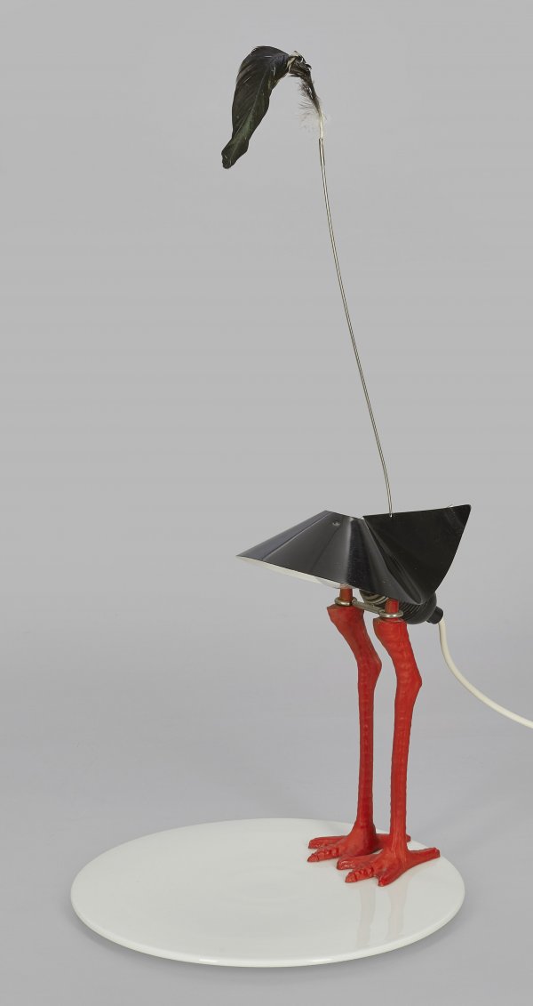 Designer Tischlampe "bibibibi" von Ingo Maurer sog. "Chicken light". Weißes Porzellan, roter Kunststoff und teilw. schwarz lackiertes Metall. Über flacher Sockelplatte als Reflektor naturalistisch gestaltete Vogelbeine als Träger für schwenkbares Leuchtmittel mit gewölbtem Schirm. Bez. 364/500 Z bibibibi Ingo Maurer sowie unterhalb Etikett. Entw. Ingo Maurer 1982 ursprünglich anlässlich der Hochzeit eines befreundeten Paares. Elektrifiziert. Ges.-H. 55 cm.