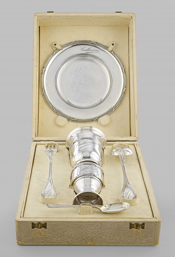 Luxus-Kinderservice Silber. 7-tlg.; Teller, Becher, Eierbecher, Serviettenring, Suppenlöffel, Gabel und kleiner Löffel, 6 Teile graviert mit "Catherine". Gest. 925. Pariser Herstellerzeichen von Emile Puiforcat und Boin-Taburet. Im Originaletui. Gew. zus. ca. 489 g. D. 17 cm.