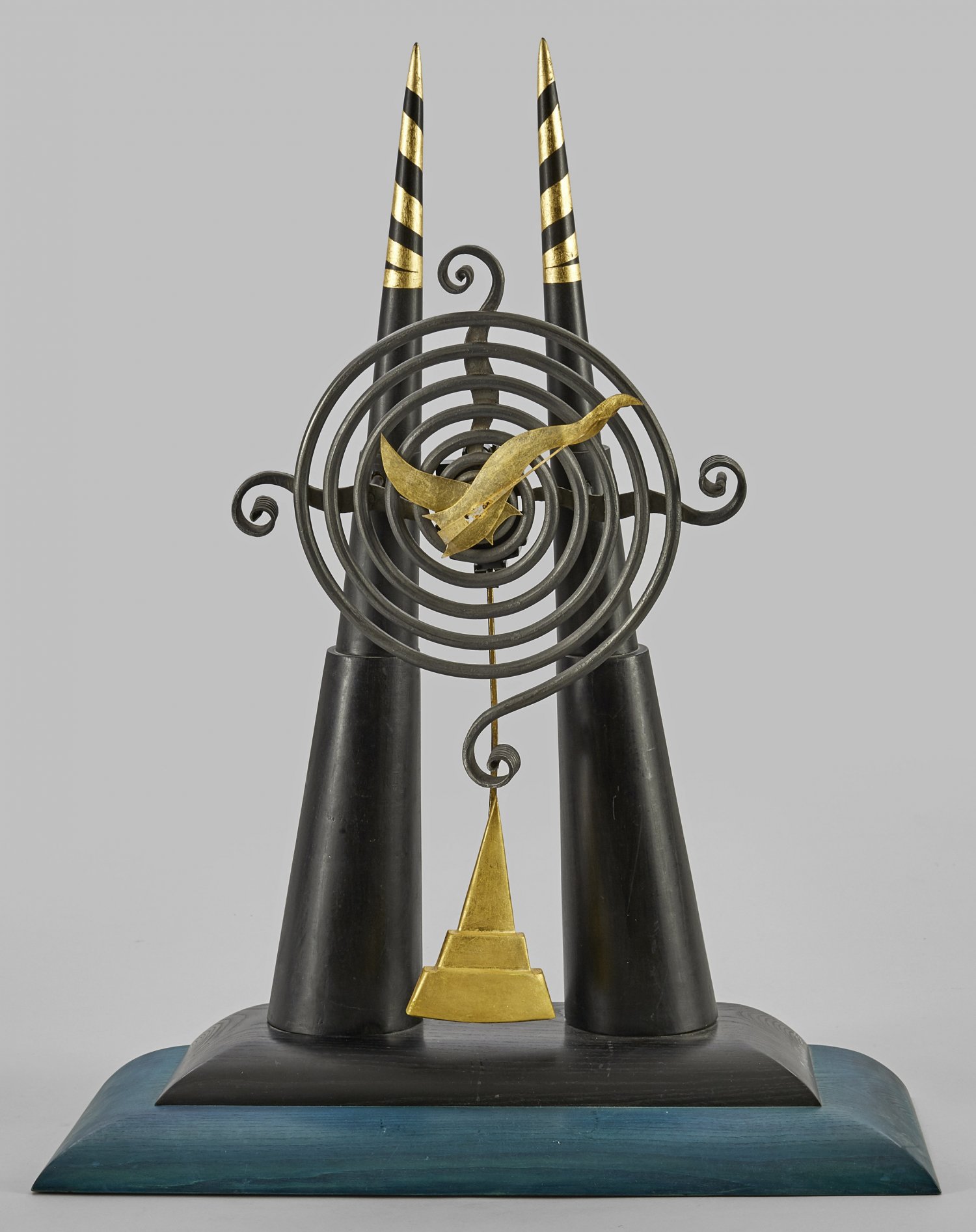 Künstler-Uhr von Vit Cimbura Holz, ebonisiert sowie petrolfarben gebeizt und teilw. vergoldet. Schmiedeeisen. Über gestuft ansteigendem Sockel schräggestellte, spitz zulaufende Streben als Träger für spiralförmiges Zifferblatt. Quarzwerk mit Schaupendel. Künstlersignet und 96 IV. sowie unterhalb bez. C. IV 96. H. 75 cm. 96 cm x 25 cm.