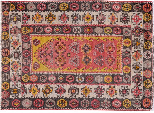 Kelim-Brücke Nordtürkei. Kurdengebiet. Wolle auf Wolle, flach gewebt. Nischenförmiges Innenfeld mit Hakenmotiven sowie umlaufend mehrteilige Bordüre aus Rautenmotiven. Altersspuren. 153 cm x 110 cm.