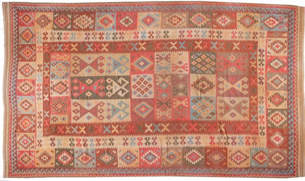 Übergroßer Kelimteppich Afghanistan. Wolle auf Wolle, flach gewebt. Im Innenfeld flächendeckende Feldermusterung in unterschiedlichen Beige-, Orange- und Blautönen. Umlaufend breite, mehrteilige Bordüre mit korrespondierenden Rautenfeldern. Colour run. 300 cm x 510 cm.