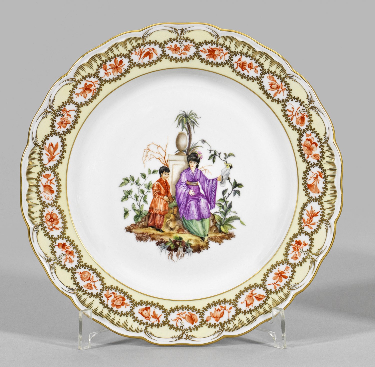 im Originalkarton. "Neuglatt". Im vertieften Spiegel szenische Darstellung einer Chinesin mit Kind in blühender Parklandschaft, auf der Fahne feine Ornamentbordüre auf zartem hellgelben Fond. Nach dem 1769/70 im Auftrag von Friedrich dem Großen entstandenen Tafelservice für das Schloss Sanssouci. Limitierte Auflage Nr. 24 von 100. Zepter- und Malereimarke. D. 25,5 cm.