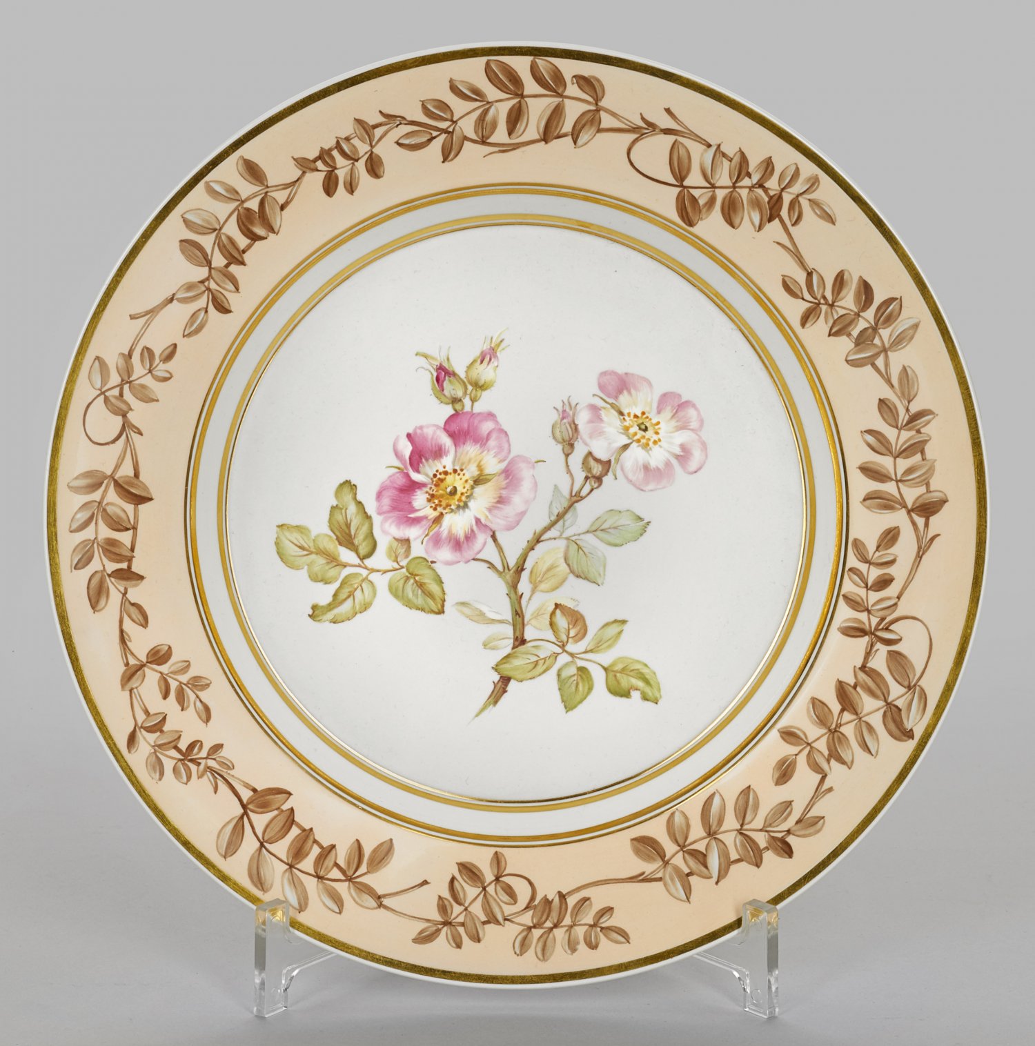 "Antikglatt". Im vertieften Spiegel farbige Darstellung eines Heckenrosenzweiges. Auf der Fahne umlaufender Blattrankenfries auf lachsfarbenem Fond. Polychrome und Sepiamalerei. Limitierte Auflage Nr. 15 von 100. Zepter- und Malereimarke. D. 26 cm.