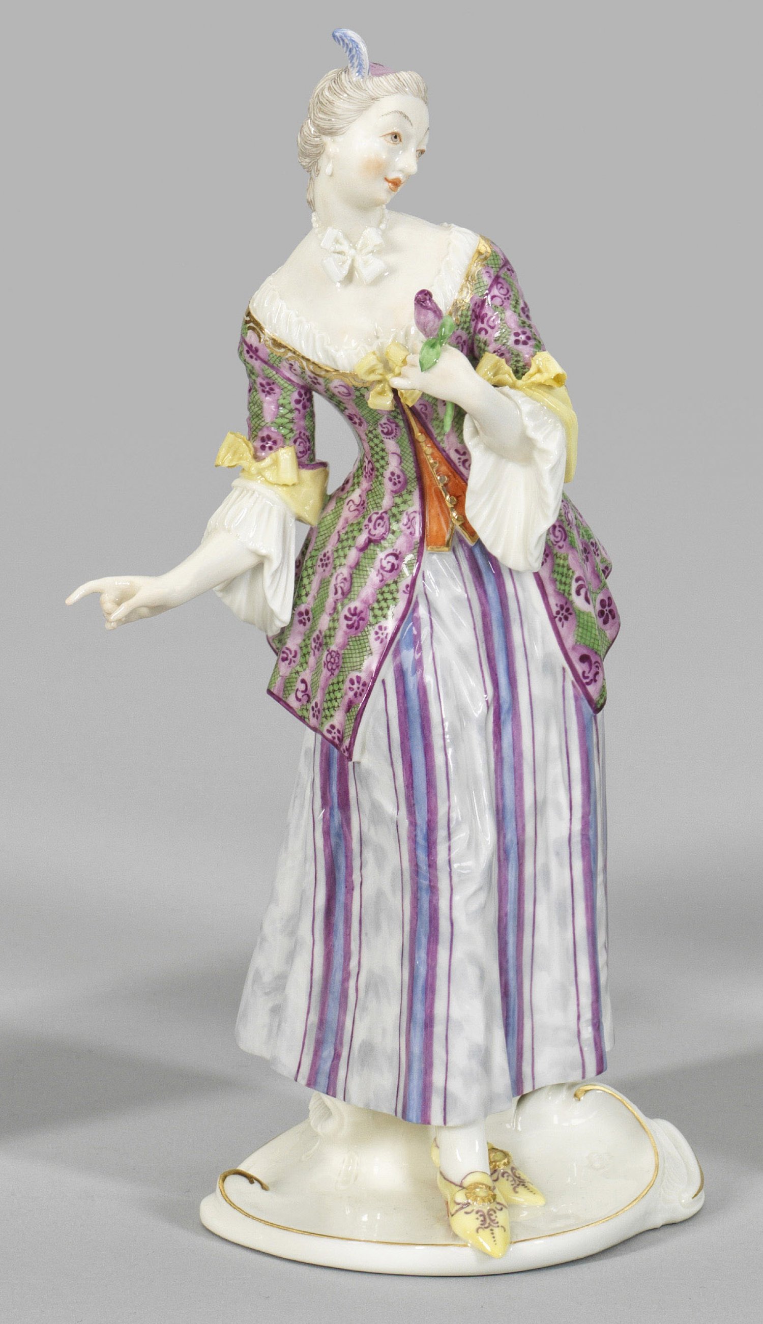 "Lucinda" aus der Italienischen Komödie Auf passig geschweiftem Sockel stehende Komödiantin in grün-violett geblümter Jacke über grauem, purpur-blau gestreiftem Rock. Polychrome Malerei mit Gold. Entw. Franz Anton Bustelli, 1759/60. Manufakturmarke. H. 20,5 cm.