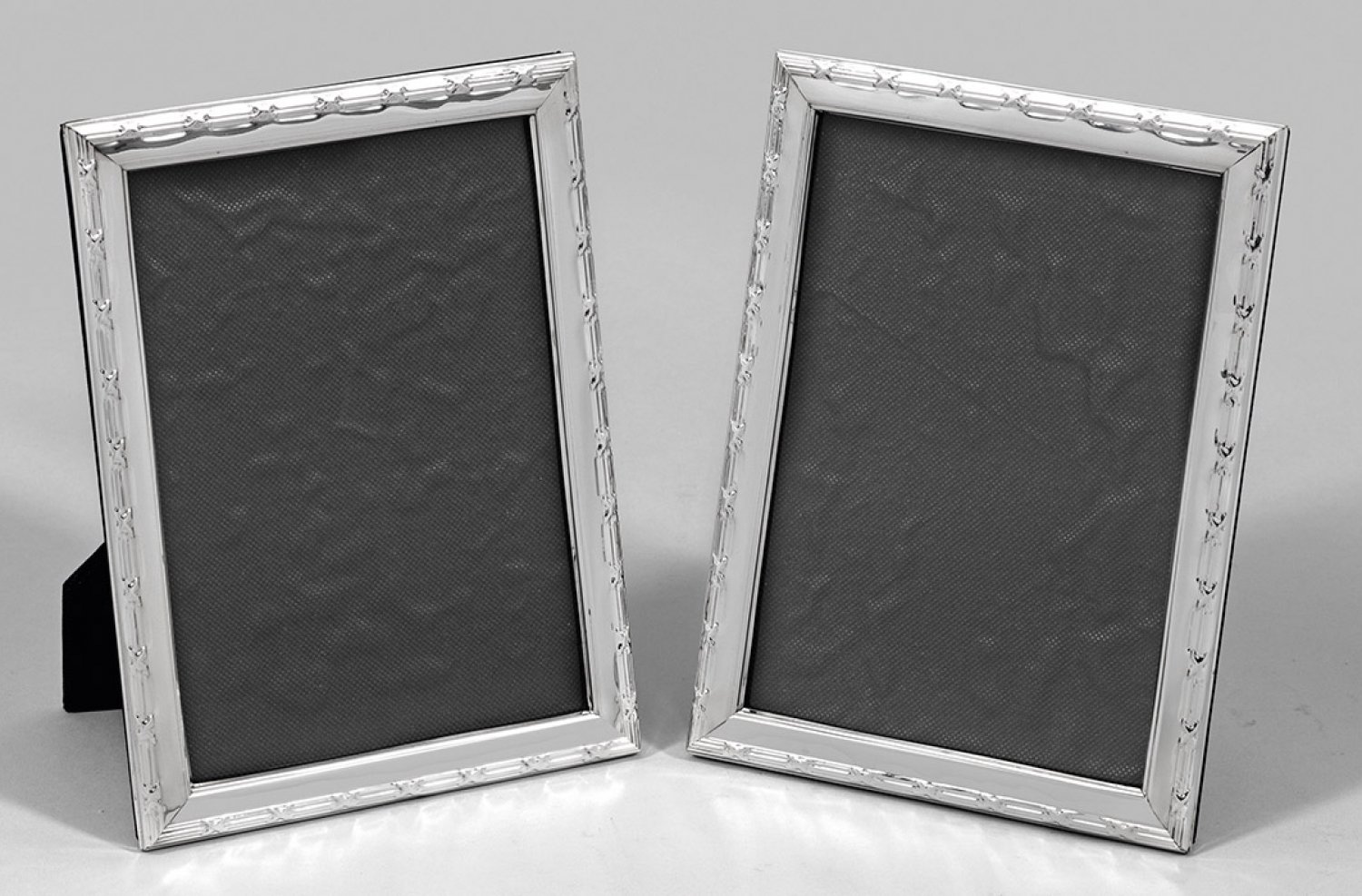 Paar Tischbilderrahmen Rechteckig. Glatter Rand, umzogen von Kreuzbanddekor. Rückseitig aufstellbar. Gest. 925. 18 cm x 13 cm. Bildausschnitt 10 cm x 15 cm.