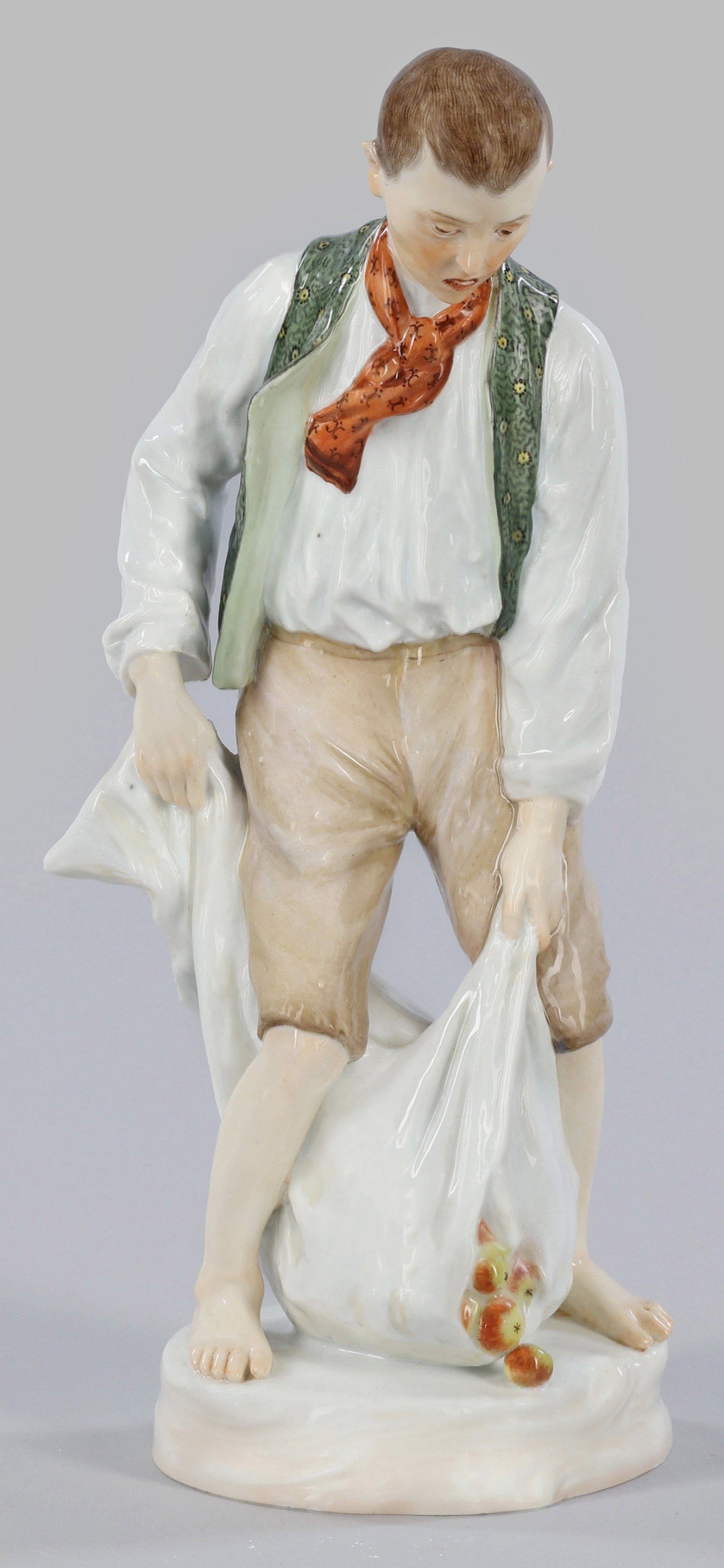 Knabe mit Apfelsack Auf ovalem, stilisiertem Sockel stehender jugendlicher Bauernjunge in knielanger, brauner Hose, weißem Hemd und olivgrüner, gemusterter Weste, einen Sack mit Äpfeln am Boden ausschüttend. Polychrome Malerei. Entw. Theodor Eichler, um 1904. Modell-Nr. U 138. Minim. best.; Rest.; Schwertermarke. H. 26,5 cm.