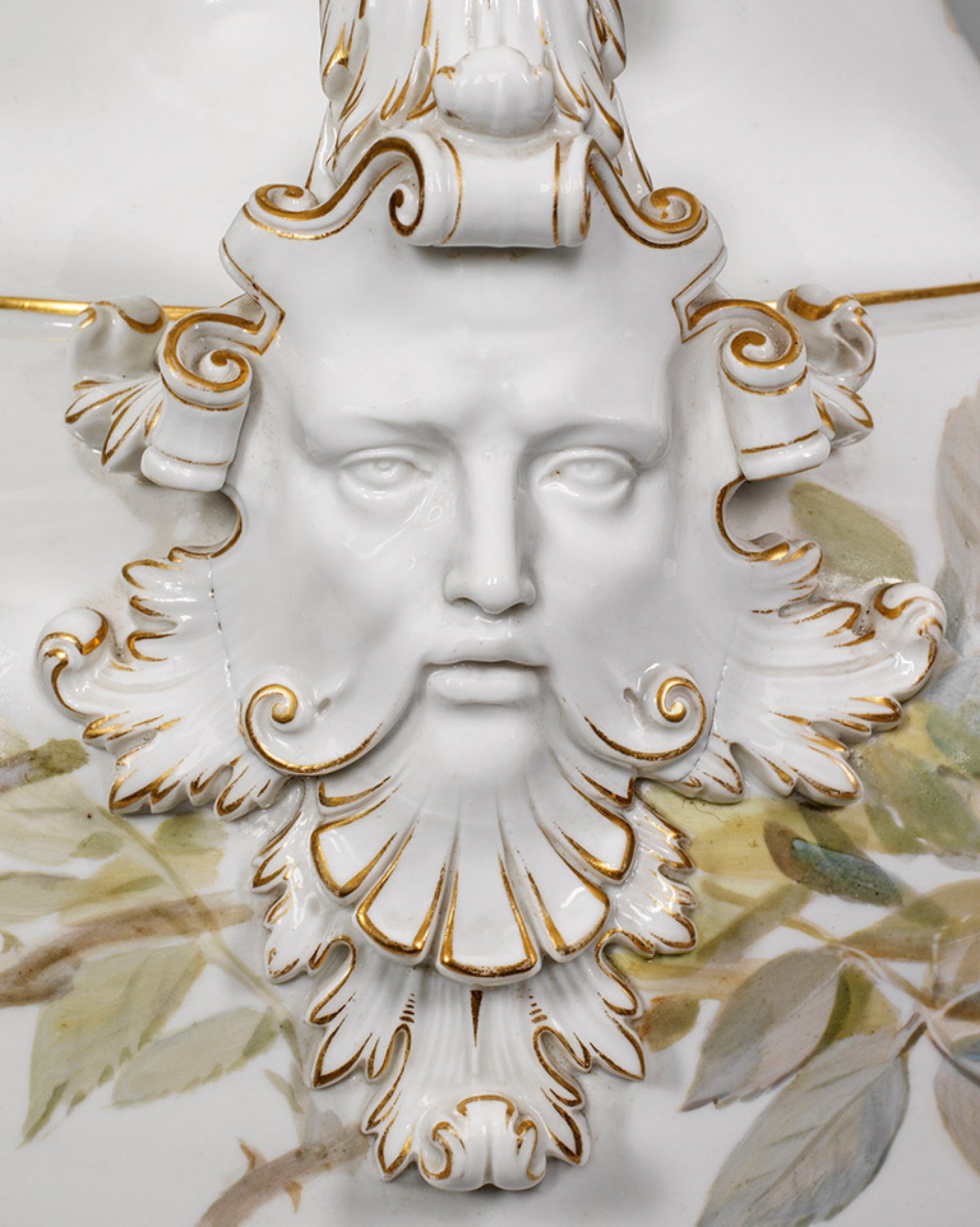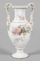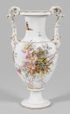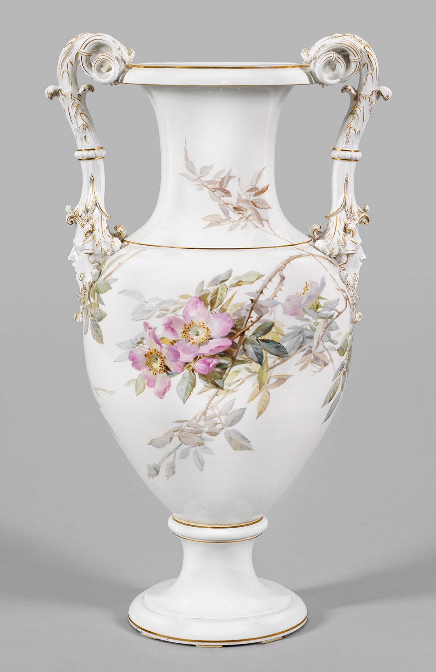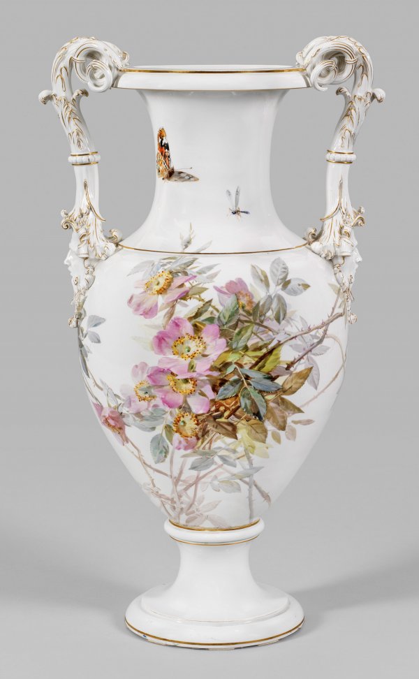 Amphorenförmiger Korpus mit eingezogenem Hals und weit ausschwingendem Lippenrand auf hochgezogenem Rundfuß. Seitlich zwei stark reliefplastische, am Ansatz aus großen, kartuschengerahmten Maskaronköpfen aufsteigende, spiralförmig eingerollte Blattvolutenhenkel. Beidseitig der Wandung feines Blumenarrangement aus Heckenrosenblüten, seitlich auslaufend in breitem Blattwerk. Der Hals schauseitig mit farbenfrohem Schmetterling und Libelle. Äußerst feine Malerei in duftig weichen, farblich abgestuften Pastelltönen wohl von Prof. Julius Eduard Braunsdorf. Brandrisse. Minim. Glasurmakel. Schwertermarke. H. 68,5 cm.