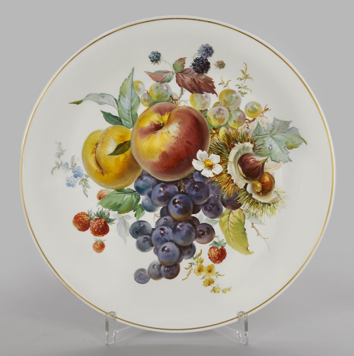 Wandteller mit Blumen- und Früchtebukett Runde, flach gemuldete Form. Im Spiegel großflächig angelegtes, farbenfrohes Bukett aus dunklen Trauben, Äpfeln, Erdbeeren, Brombeeren und Kastanien sowie verschiedenen Blumen. Weiche, impressionistisch anmutende Malerei. Goldrand. Minim. rest.; Schwertermarke. D. 31,5 cm.